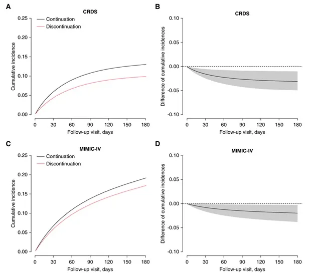 (B) Diferença de risco entre pacientes com descontinuação ou manutenção de iRAS no banco de dados CRDS.