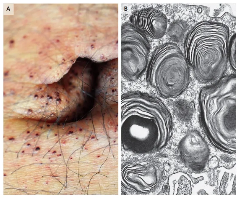 A presença de proteinúria não nefrótica motivou investigação renal. Realizado biópsia renal que revelou podócitos vacuolados, e a microscopia eletrônica mostrou os característicos depósitos lamelados de globotriaosilceramida, os chamados **corpos zebróides (Figura 1)**. Esses achados reforçaram a hipótese de Doença de Fabry.