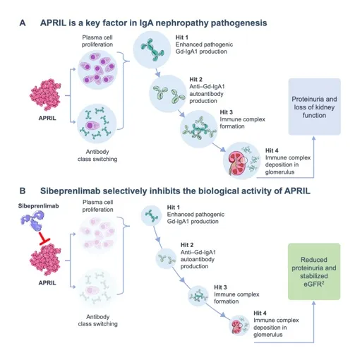 O sibeprenlimabe (anota esse nome ai!) é um anticorpo monoclonal IgG2 que bloqueia o APRIL, atacando um dos gatilhos imunológicos iniciais da doença!