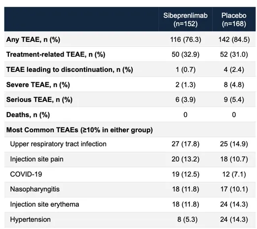 Perfil de segurança do sibeprenlimabe comparável ao placebo, com menos eventos graves. TEAE: evento adverso emergente do tratamento.