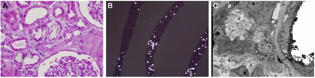 Imagens de biópsia. (A) A microscopia óptica demonstra cristais de oxalato intratubular difusos. (B) A imunofluorescência demonstra birrefringência quando vista sob luz polarizada. (C) A microscopia eletrônica demonstra cristais de oxalato intratubular.